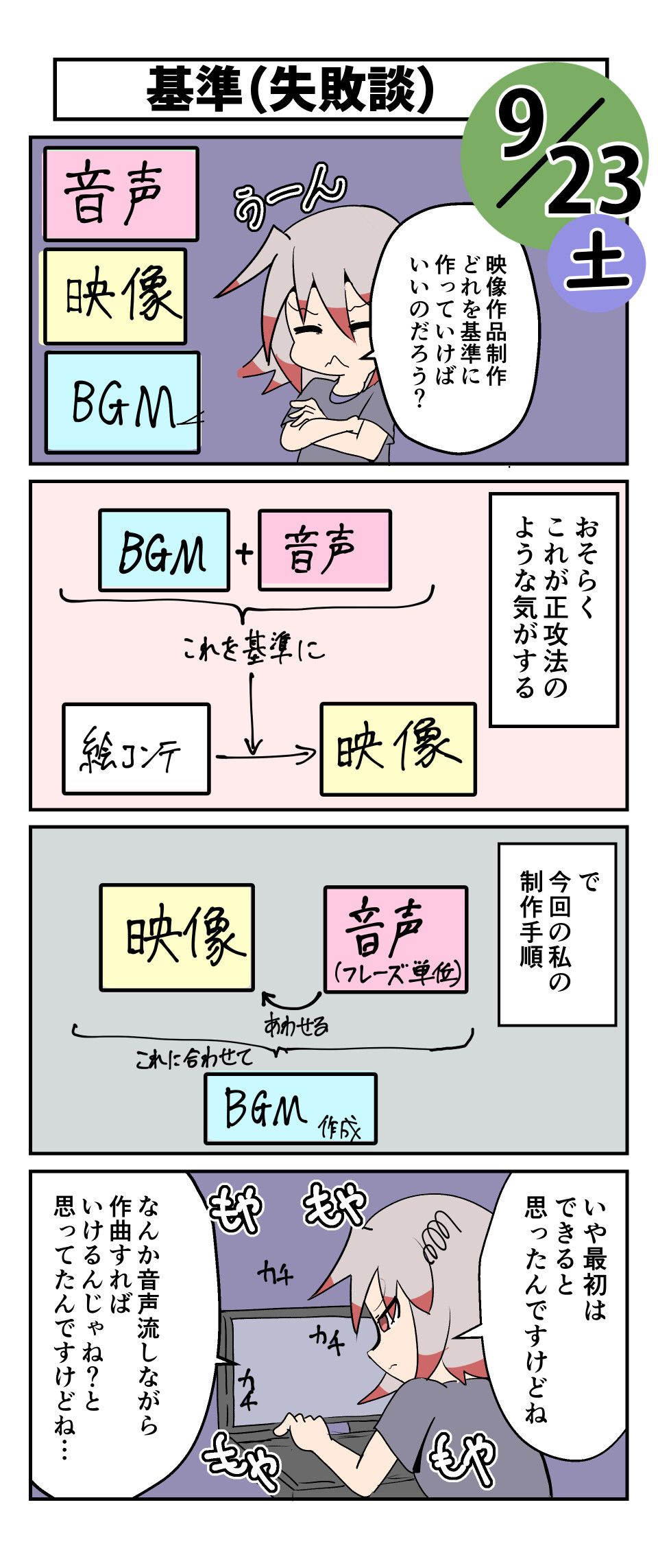 「音声」と「BGM」があって、それをベースに「画面」を作るのが正攻法のような気がして