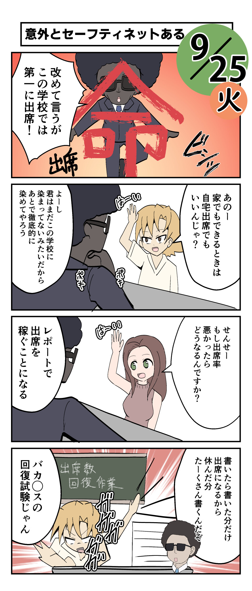 その間の場合は、春休みに学校来てレポート書いて、書いた分に応じて出席率を回復するらしい