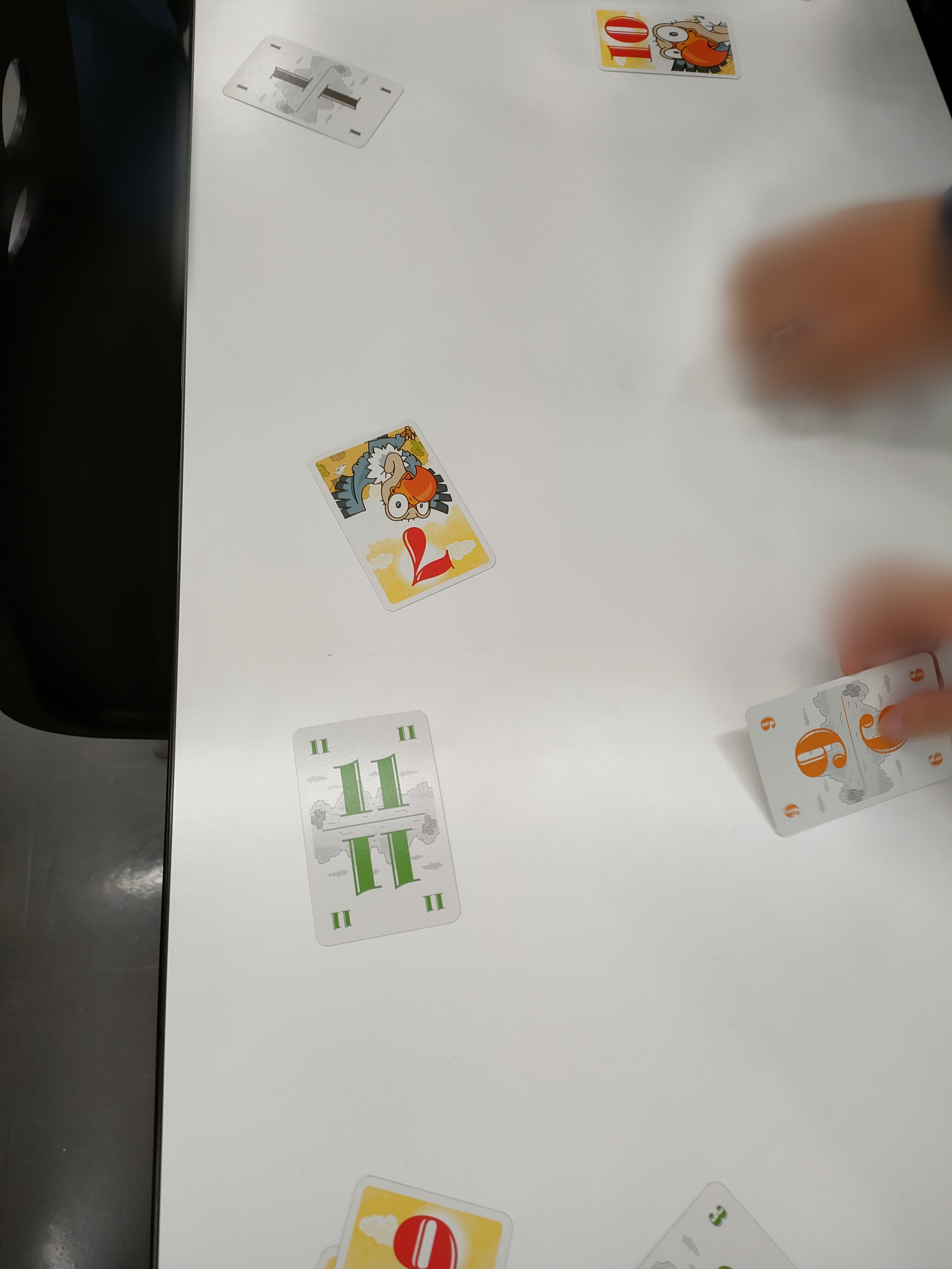 同時にカードを出して、一番数字が大きい人が場に出ている得点カードを獲得できる。でも、他の人と数字がバッティング(被る)すると無効になって次点の人が獲得するという読み合いが入るゲーム。