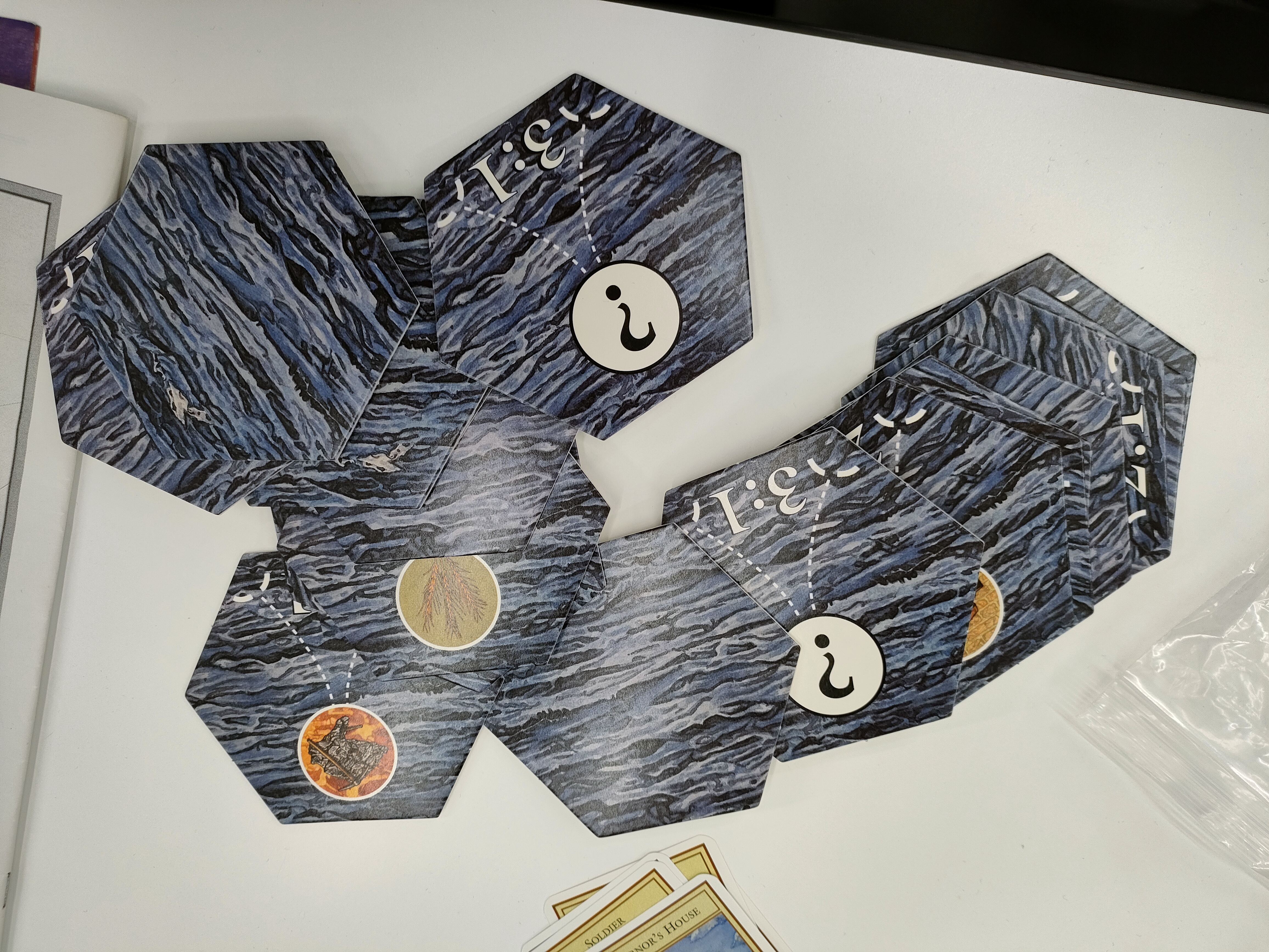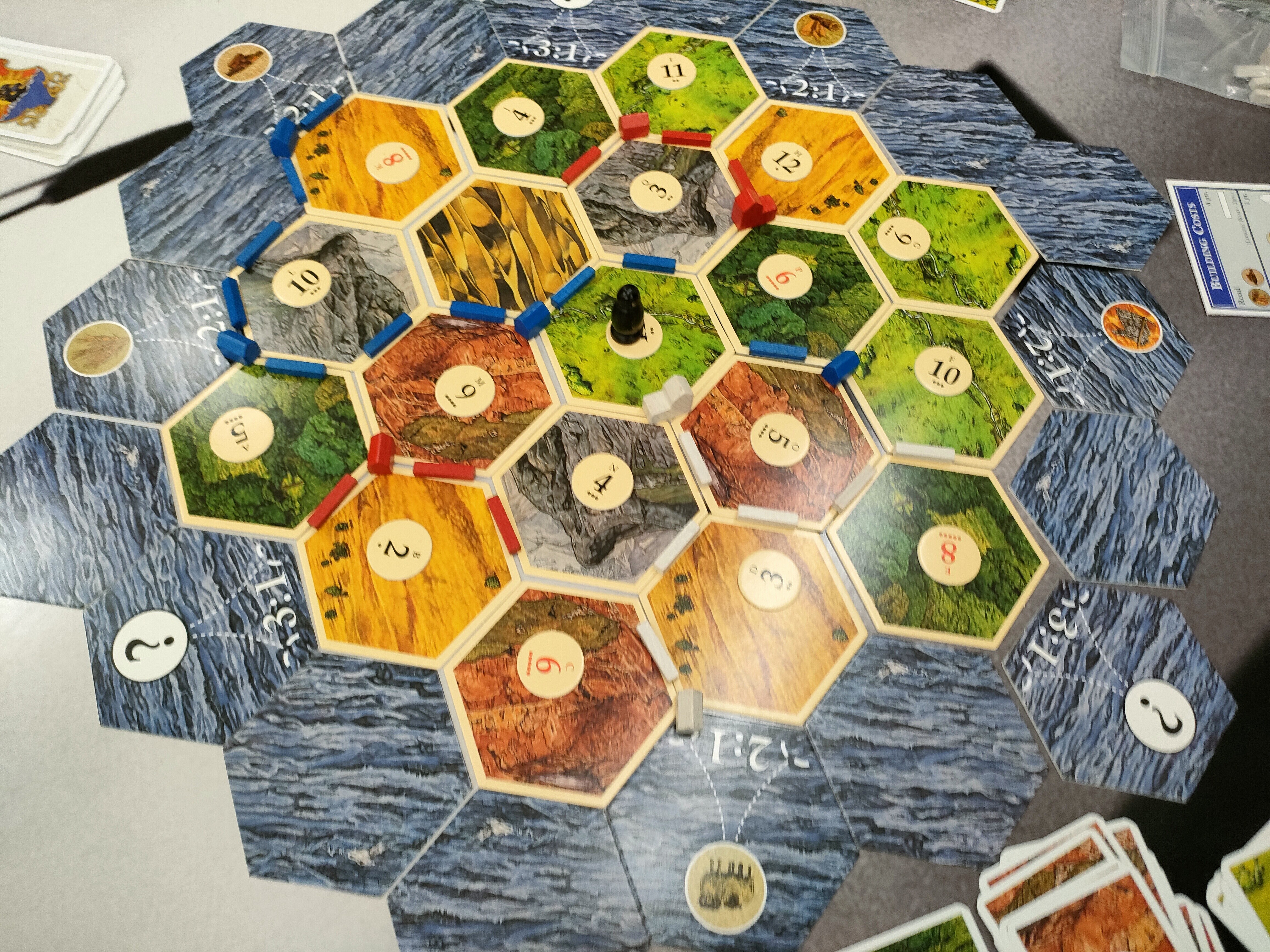 今のカタンは港のパーツははめ込むことで枠を作れる構図になってるけど、このカタンは同じタイル状になっていたからタイルを並べるのに苦労した。