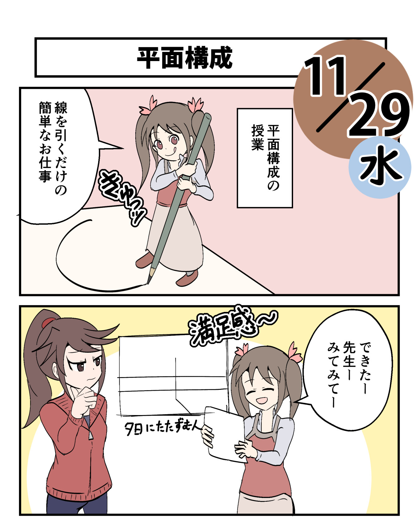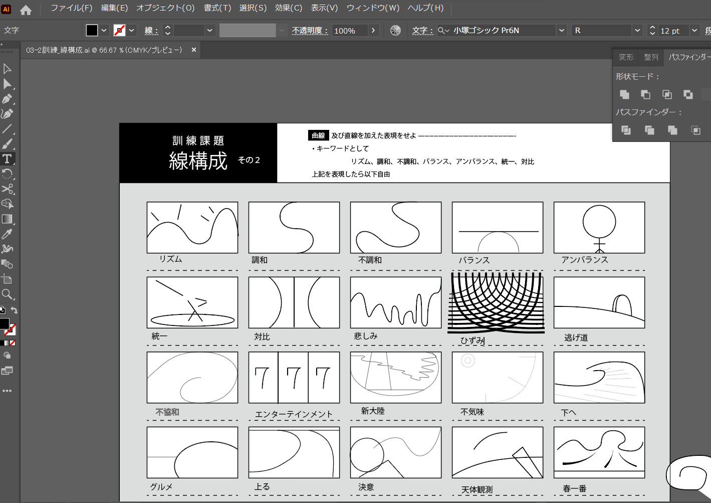 イラストの授業はGFFイラストコンテストが終わり、平面構成の授業に入っていきました。これから構図とか演出の話がメインになってきそう。
