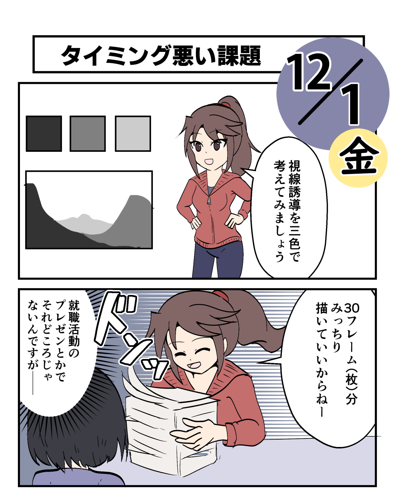 就活プレゼンの準備が迫ってきている状態で、イラストの課題をじっくりと取り組んでほしいと言われてもなかなか難しいものがある。優先度の付け方的に厳しいものがあるよねっ