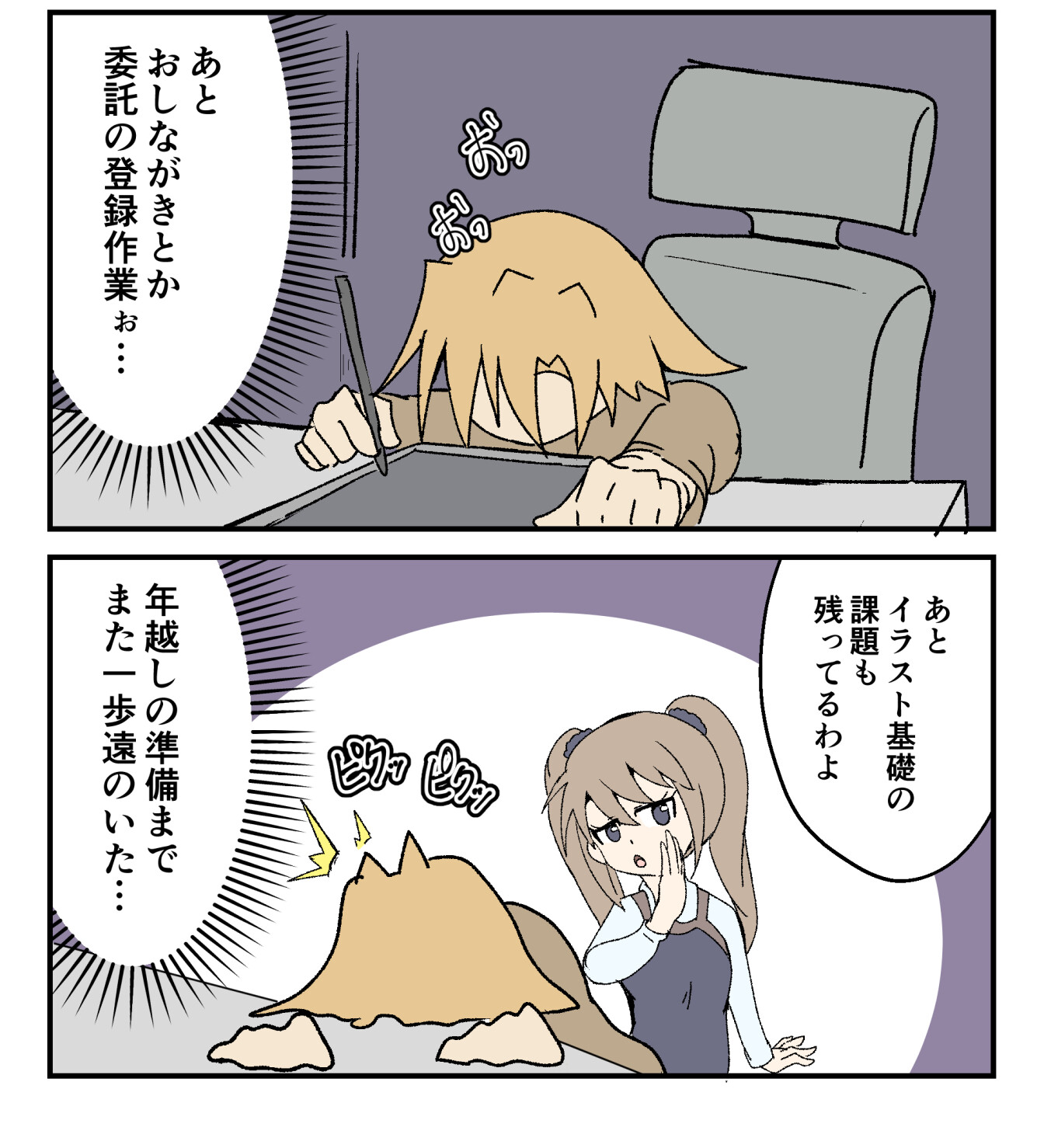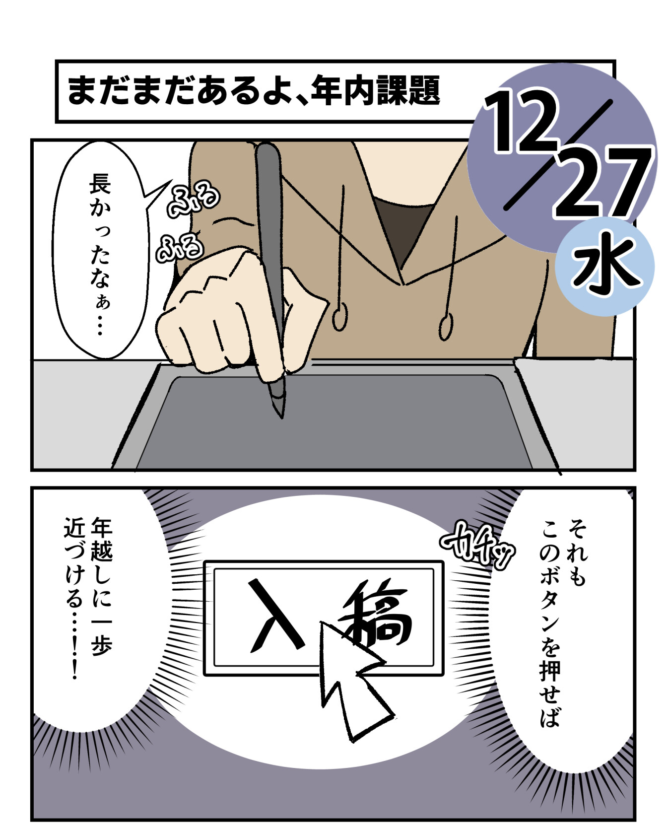 2023年12月27日 冬コミ入稿完了!…でもまだ課題がある 冬コミ入稿完了しました!!パチパチパチパチでもまだイラスト基礎の課題が残っているから休めない…それにコミケ合わせのおしながきとか宣伝とかやることいっぱいいっぱいまーだ、冬休み入るのに時間がかかりそう昨日の一日突貫作業を続け、なんとか締め切りの朝7時までに入稿ができた!!これでとりあえず新刊出せる―!!大きいタスクが一個過ぎて、ほっとするのも束の間、さーて次はおしながきや、委託準備や宣伝や…やることはまだまだてんこんもり。あと並行してイラスト基礎の課題もしなきゃいけないから、それもそれでがんばらないとね…ほんと、年末ギリギリまでゆっくりすることはできないのかちなみに入稿したの確認したらそのままベッドに入って、昼まで仮眠してた。徹夜は寿命を削るよ… 「冬休み」カテゴリの最新記事 < 前の記事次の記事 > コメント コメントフォーム 名前 コメント 記事の評価 リセット リセット 顔 星 情報を記憶 コメントを投稿する