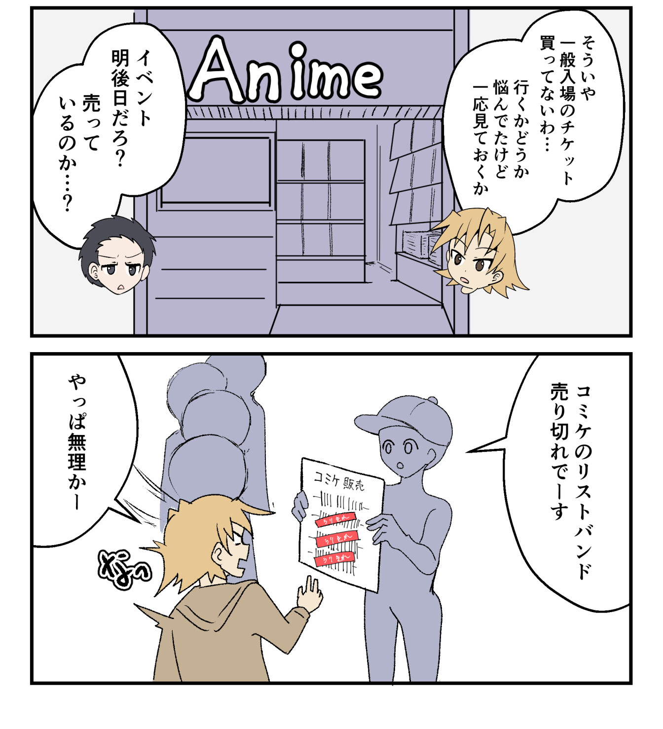 結局リストバンドはどこも売り切れで手に入れることできなかったから、冬コミの1日目はもういっかな…