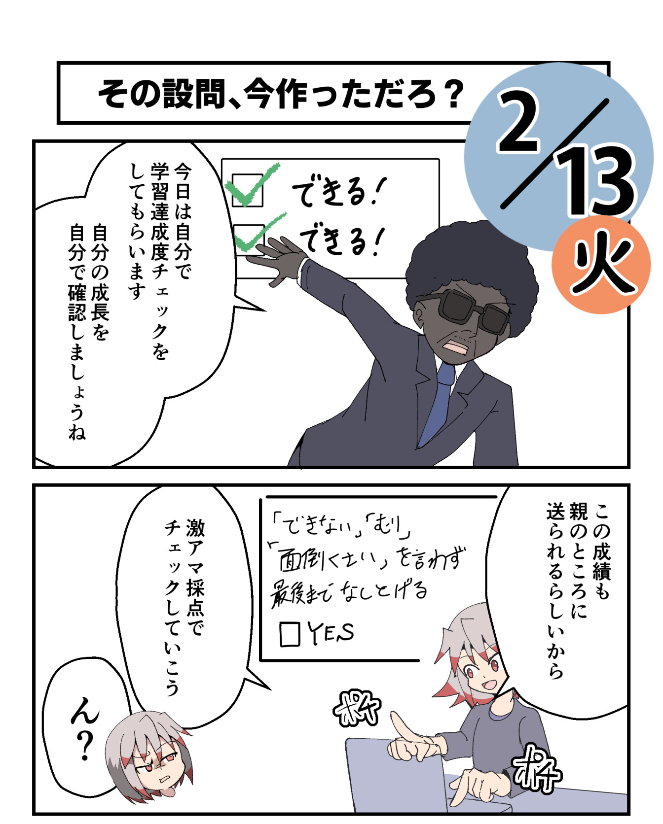 自己評価チェックとかいう自分で自分を褒めるチェックシートをホームルームの時間につけてた。