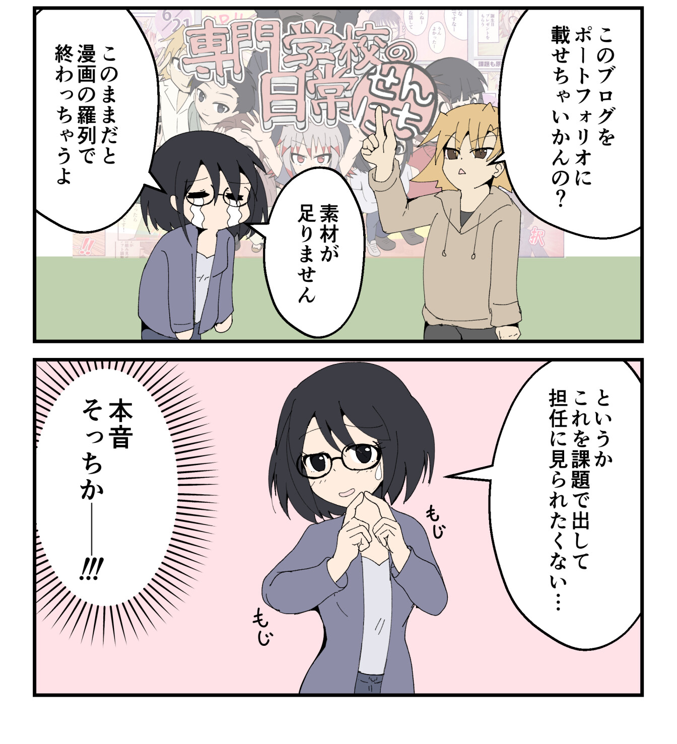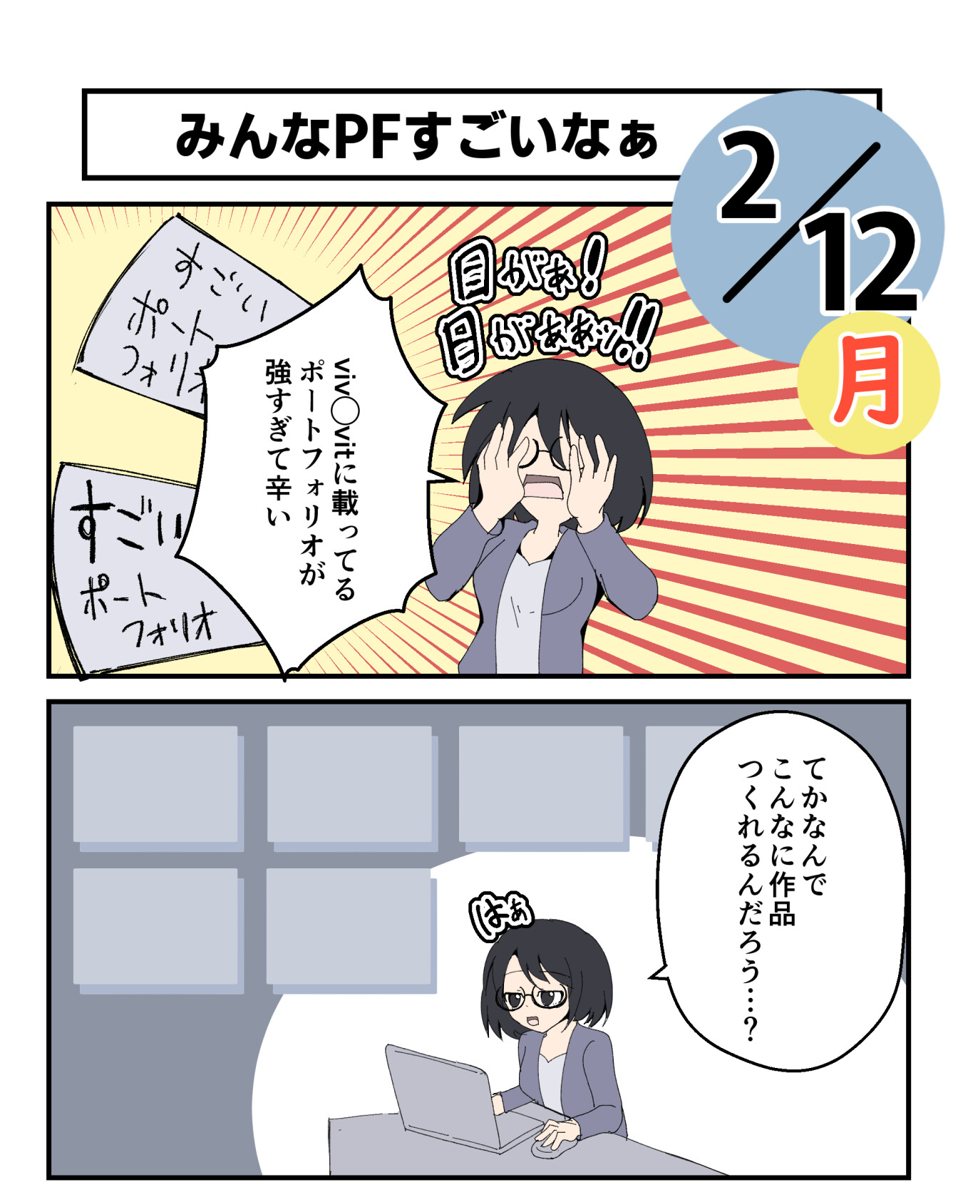 2024年02月12日 ポートフォリオ ポートフォリオの課題提出のためにちょっくら進める。前回のポートフォリオ制作から進化させるときがきた vivivtのポートフォリオがおすすめ就職ガイダンスのときに紹介されてた「vivivit」ここに会員登録すると優秀な人たちのポートフォリオをみることができるのでおすすめです!ただダウンロードとかは禁止されているからあくまでも参考という形でね登録して「ポートフォリオ」とかで検索したら編集部のおすすめのポートフォリオが表示されるから、自分が目指す業界のポートフォリオの参考になるという。<引用:https://www.vivivit.com/>※一部加工修正していますまぁみんな優秀すぎて凹むわ…vivivitのポートフォリオみてイラストとか載せているポートフォリオもあったからどんな感じで載せているかみていたけど、しっかりコンセプトと製作工程で、「ここはこういう意図!」とかを明記しているからやっぱただ描いているだけじゃだめなんだな…って思いました、ハイ。このままだとこのブログは漫画の羅列サイトでしかないぞ!!ポートフォリオといえばこのときにも先輩のポートフォリオみて打ちのめされてたっけフォローよろしく! 「就活準備」カテゴリの最新記事 < 前の記事次の記事 > コメント コメントフォーム 名前 コメント 記事の評価 リセット リセット 顔 星 情報を記憶 コメントを投稿する