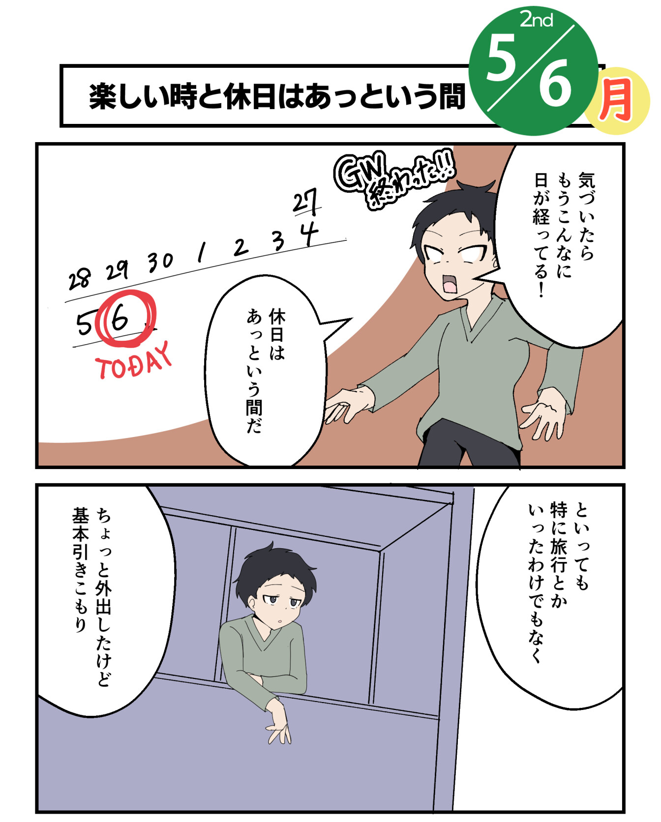 2024年05月22日 【悲報】10連休のGW終わる G Wが終わる。10連休はあっという間だったな…GWが終わる私に残ったのは、体力が落ちた身体でした。本当に家から出ないと体力落ちまくってしまうね。働き方としてフルリモートとかあるけど、それやっちゃうとどんどん体力落ちてしまいそう意識的に体を動かす習慣作らないと将来、体弱弱な人間になっちゃうぞちなみにGW後半はサイト作り頑張ってた気がする。就活はしていない。GWといえば去年はガストでこもりっきり作業してたから外に出ていた分まだマシ…? 「休日」カテゴリの最新記事 < 前の記事次の記事 > コメント コメントフォーム 名前 コメント 記事の評価 リセット リセット 顔 星 情報を記憶 コメントを投稿する