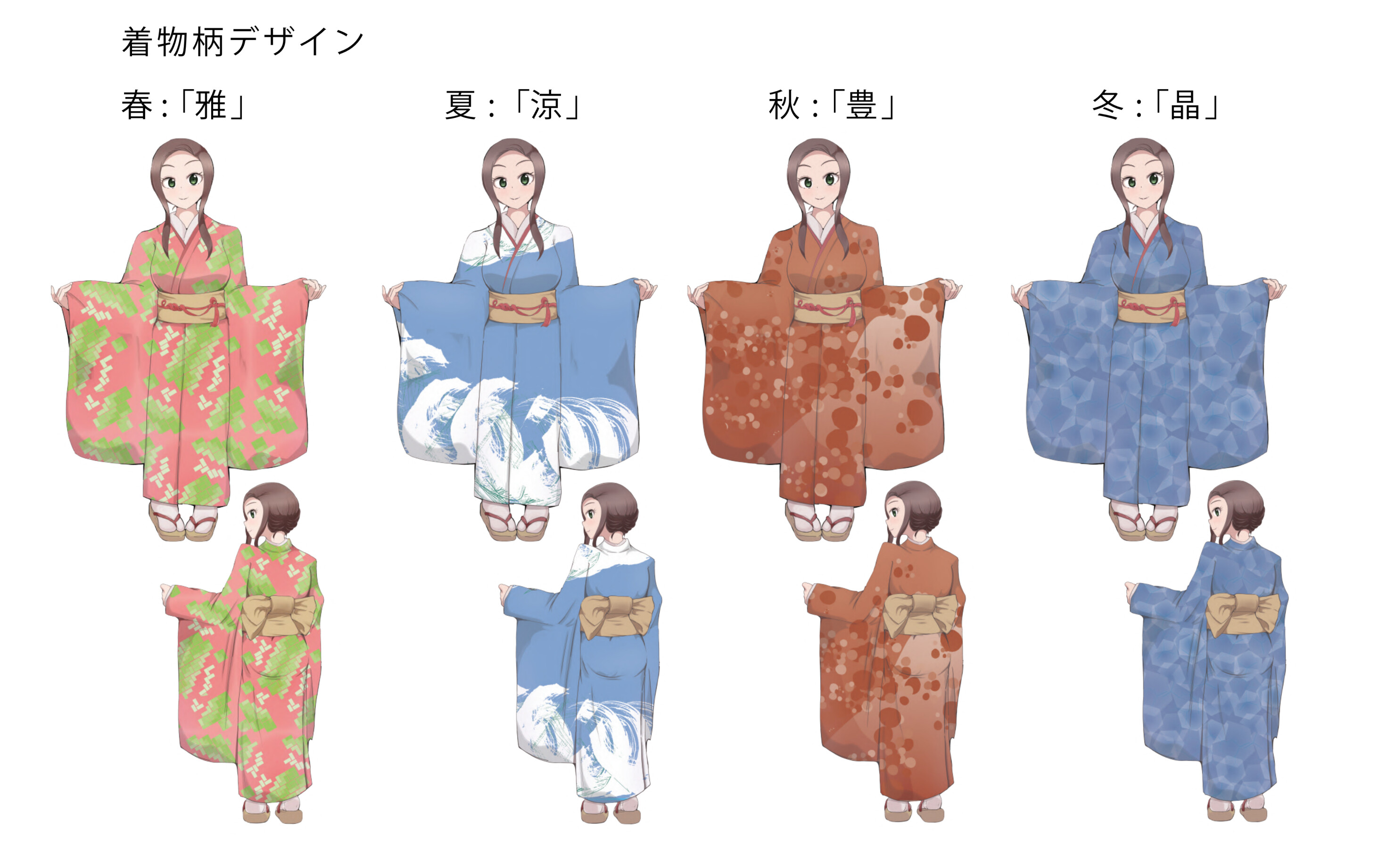 四季をテーマに作成した抽象形態のテクスチャを着物の柄として合わせます。