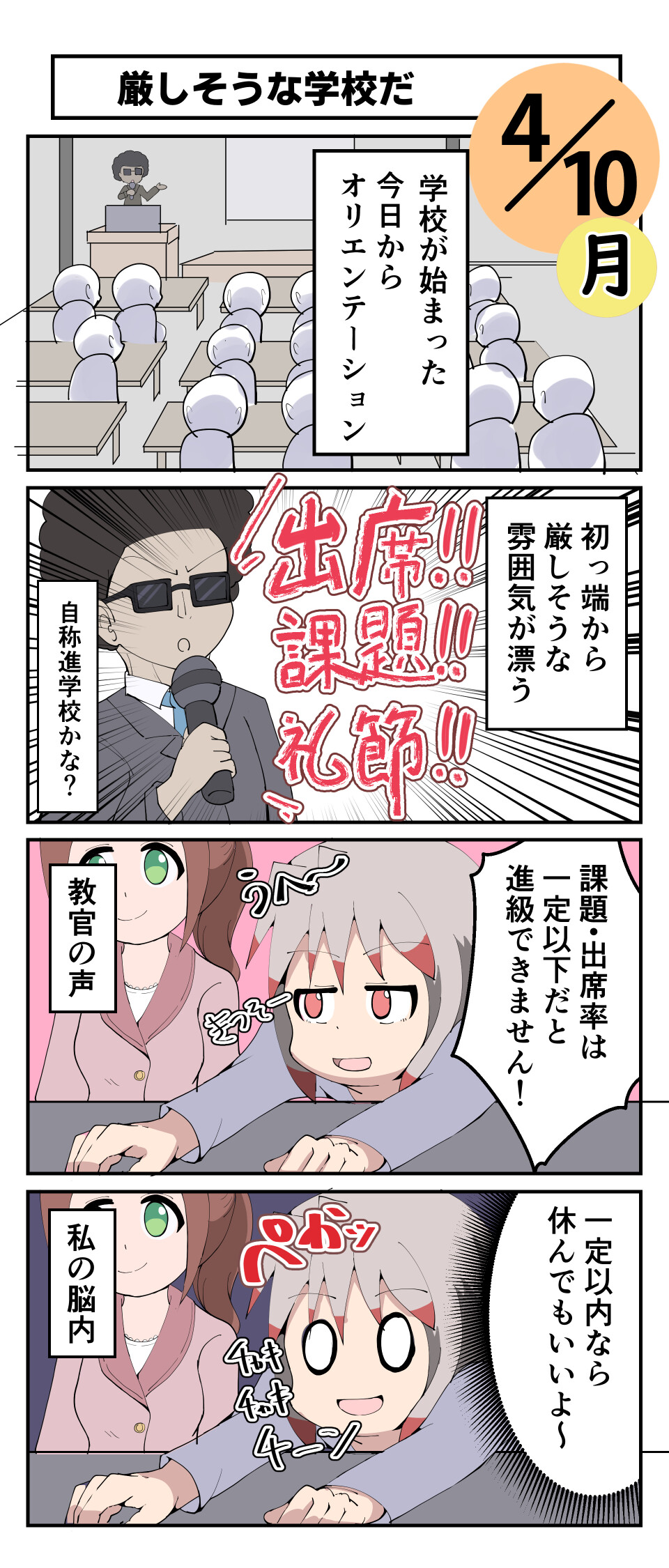 出席、課題提出も厳密に。遅刻の取り扱いやら、学内で過ごし方、挨拶…