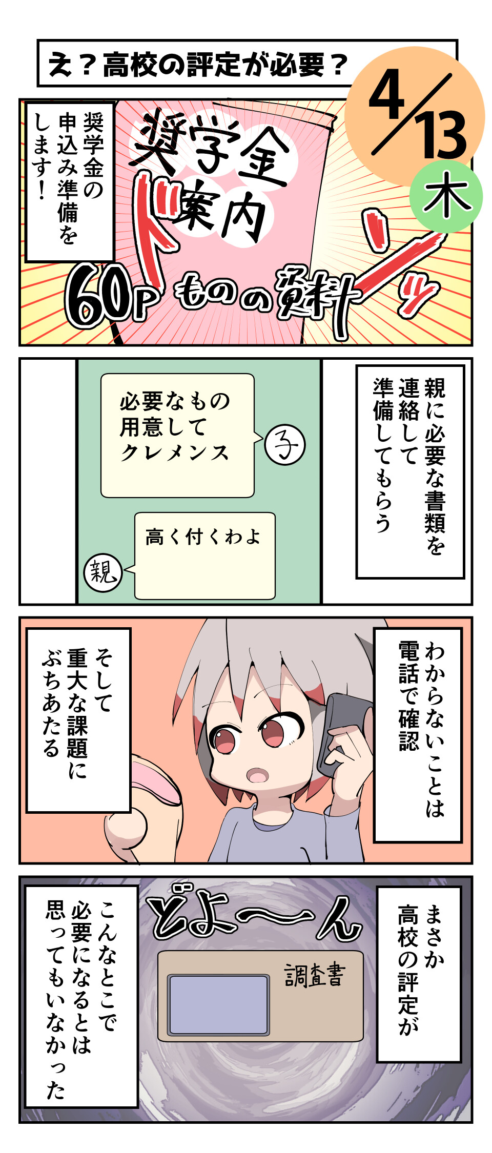 奨学金の申込み準備は早めにしましょう。あと家族間の関係は良好にしておくのに越したことはないですね。
